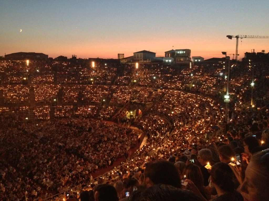 My cousin Ornella works for the Arena (an outdoor venue from the Roman era) which hosts the biggest Opera season in the world. From June-early September there is a show every night. However, the night we happened to attend was an historical event. I’m being totally serious. It was the 100th birthday of the Arena as an Opera house. (We even sang happy birthday and everything.) On August 10, 1913 the Arena opened with Giuseppe Verde’s show, Aida. On August 10, 2013 Patrick and I watched Aida in the Arena, complete with a 1913 restaging of the show. The Arena was sold out and it was spectacular to see the place full, a total of 15,000 people.