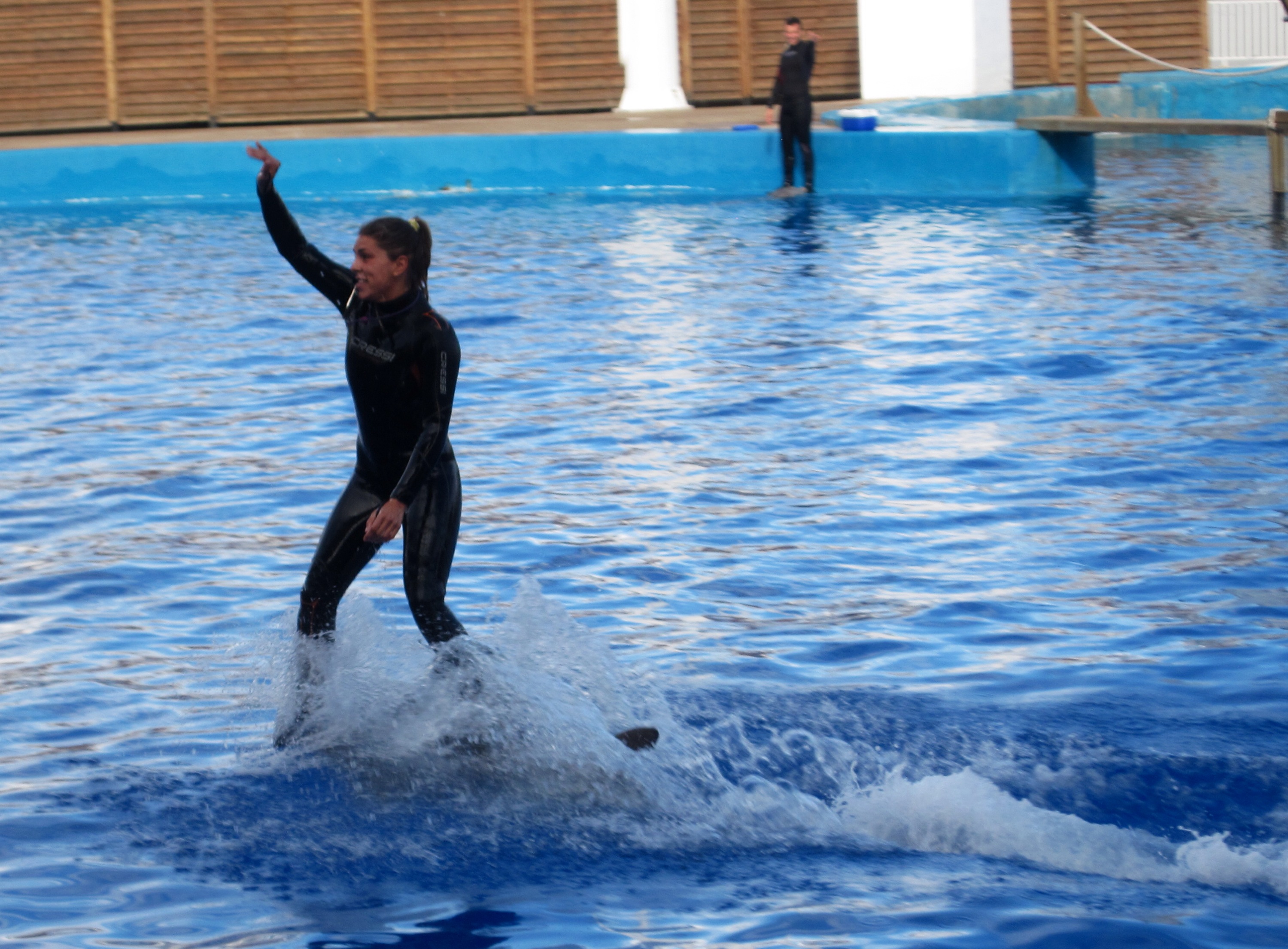 Yes, that would be a human riding a dolphin like a surfboard.