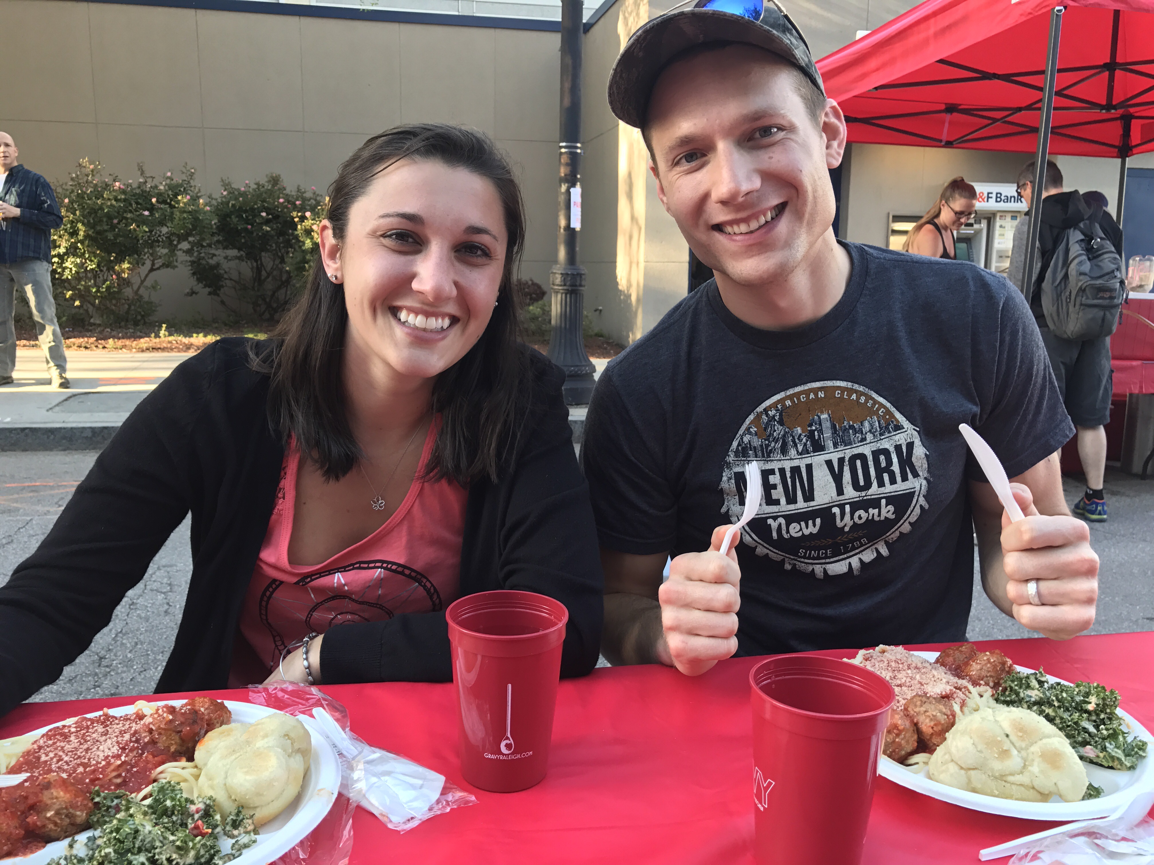 That night, we walked downtown for the Rockin’ Raleigh Spaghetti Dinner. The spaghetti dinner was a fundraiser and was put on in conjunction with the half marathon. For $10 each we got a plate full of spaghetti & meatballs, salad and garlic bread. They had live music and had closed off the street so it was a semi block party. Everyone sat together on this long table in the middle of the street. I had never done this before a race and I thought it was a great! We had time to chat with other people that were running the race and listen to their stories. It also got us out of the house and eating a yummy, affordable meal before running the next morning.
