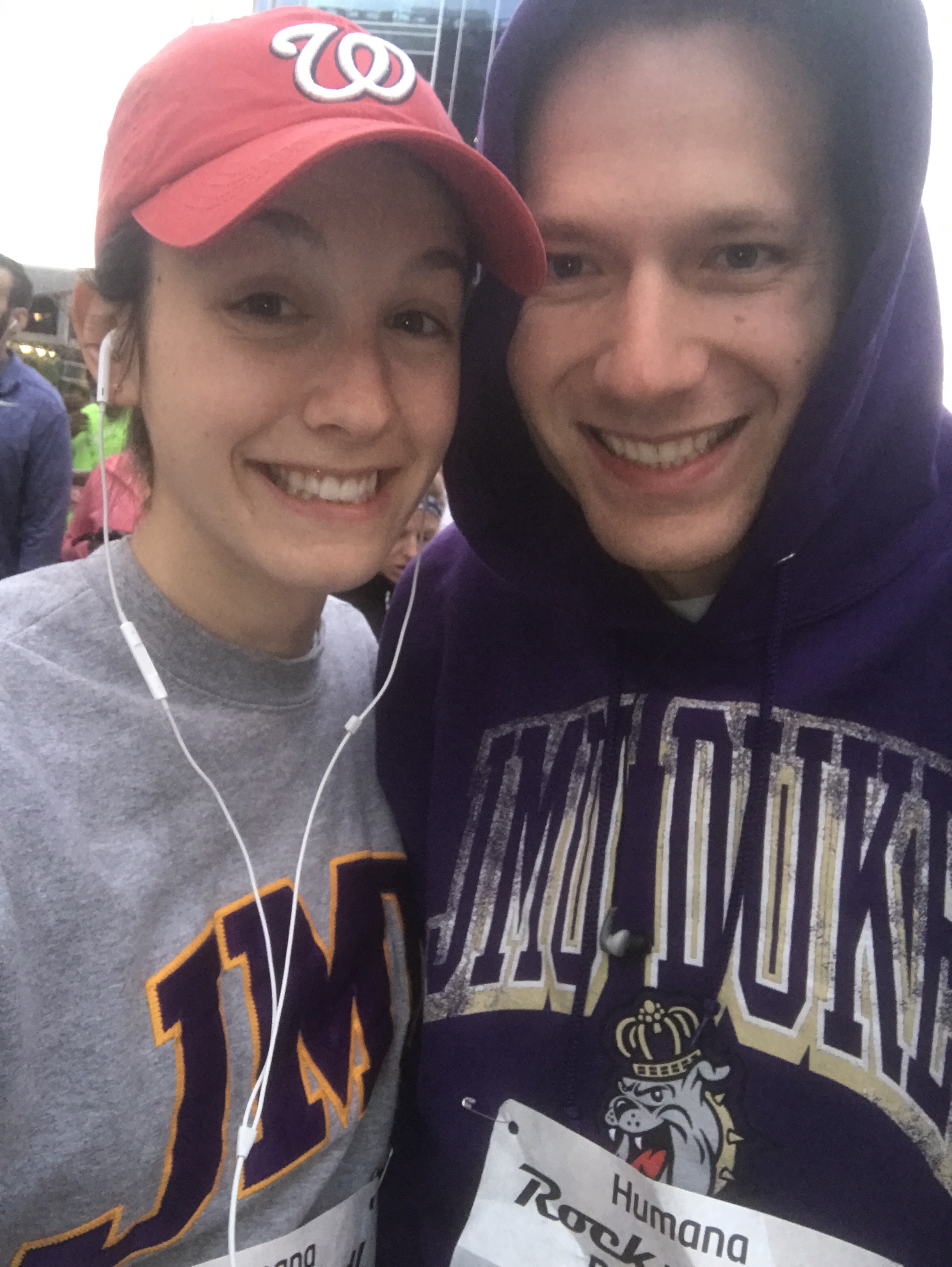 Eventually, we headed out to take our position in line. After my last race in Las Vegas, it felt like the Raleigh Half Marathon was TINY!! Of course, there was still 7-8 thousand people, but compared to the 50,000 in Vegas it didn’t seem large at all. As with other races, Elyana immediately went to the front of the race corral…being that she is speedy McSpeedster over here. Andy and I stood in the back 25% and really, we were okay with that. Ironically, Andy and I were hardcore matching during the race. Since it was colder than expected, we both were wearing our only sweatshirts…which happened to be JMU. But since you always know I’m down to represent JMU, I wasn’t against it at all. 🙂