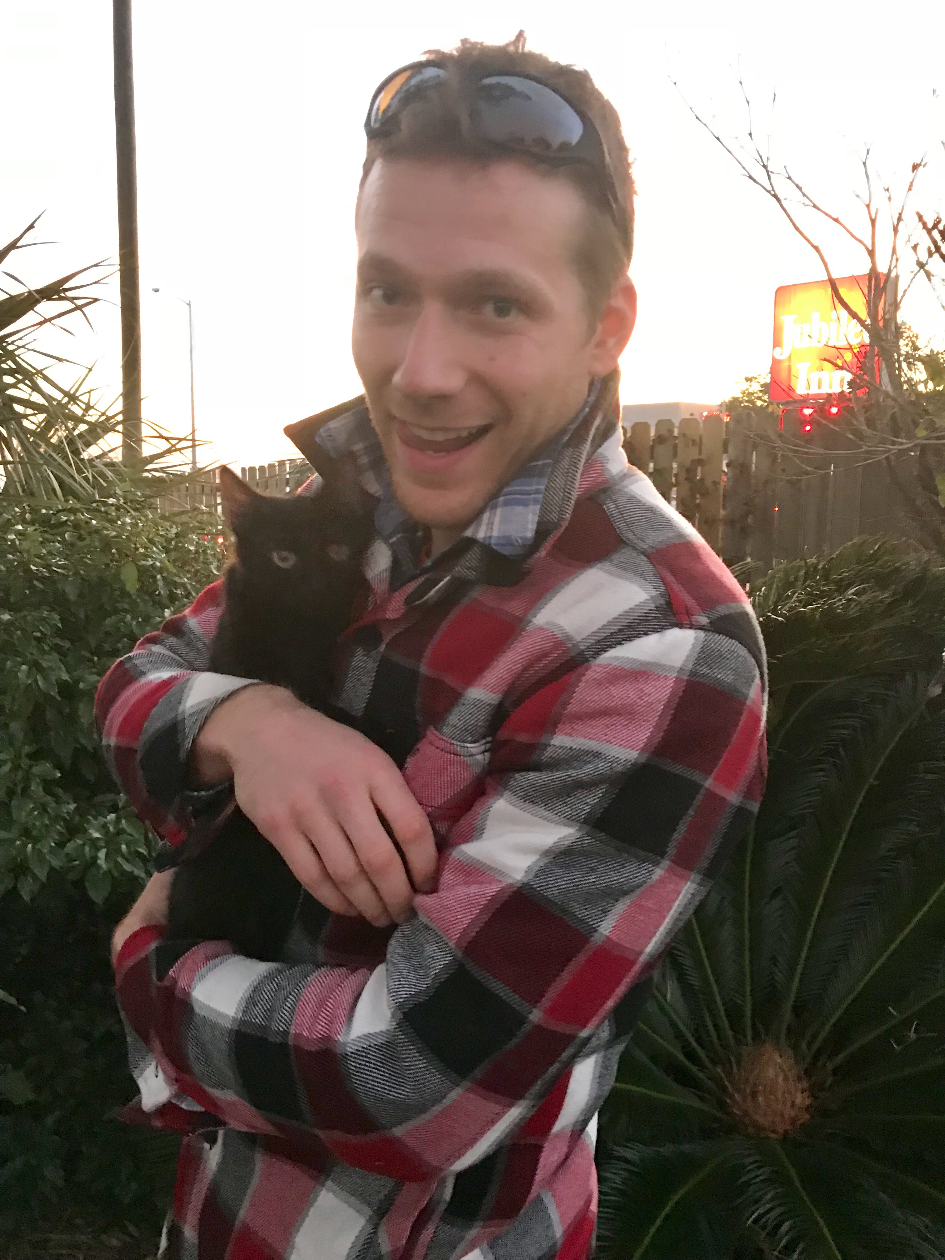 Alright story time: On our first night in Biloxi, Andy and I found a baby black kitten hiding in the bushes on the side of the street. Obviously we had to stop and make sure the cat was okay. We were expecting the cat to run away from us (because duh, it’s a cat haha), but weirdly the cat came right up to us. It didn’t look injured, but it looked very skinny and hungry. We picked up the cat and took it into the car with us (remember it was actually freezing that night) while we tried to call shelters so we could take the cat somewhere.